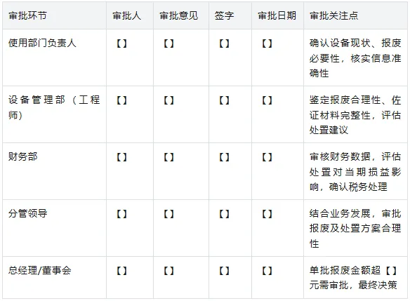 另外,若审批人休假,可提前设置“代理人”,避免流程停滞;审批完成后,及时提醒设备部更新资产台账,财务部同步进行账务处理(分录示例:借:固定资产清理/累计折旧,贷:固定资产),确保账实一致。