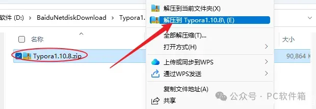 1.解压安装包:鼠标右击【Typora1.9.5】压缩包,选择电脑上安装的解压软件,点击解压到【Typora1.9.5】。