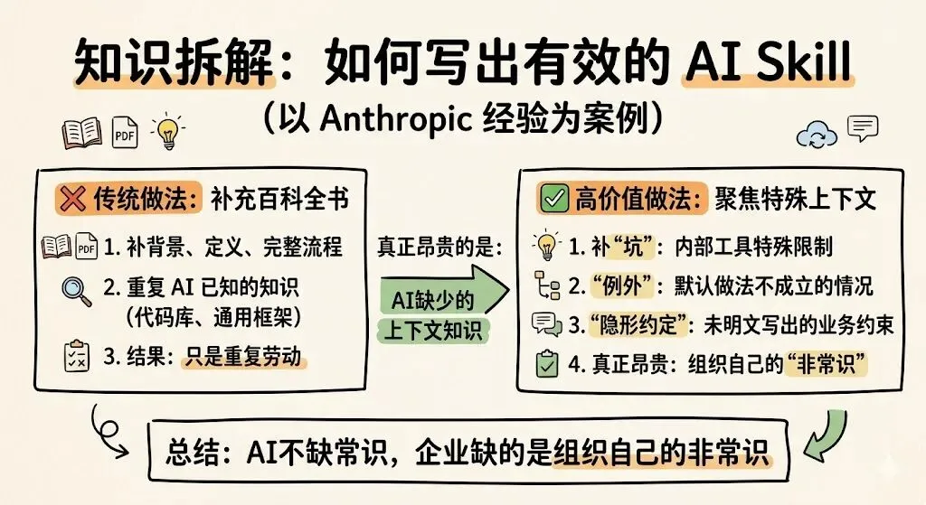 过去企业文档最常犯的错误,是把“知道什么”写得很多,把“为什么这里不能这么做”写得太少。Anthropic 这份总结等于提醒了大家:到了 AI 时代,通用知识会越来越便宜,真正昂贵的反而是上下文知识和例外知识。