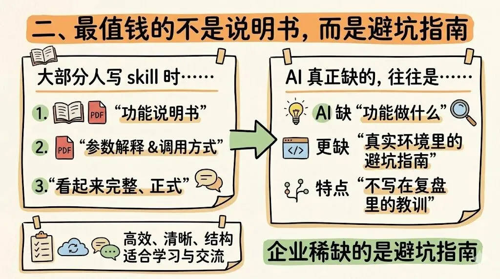 因为大部分人写 skill 时,习惯先写功能说明、参数解释、调用方式,看起来很完整,也很像一份正式文档。但 AI 真正缺的,往往不是“功能能做什么”,而是“这个功能在真实环境里会怎么翻车”。
