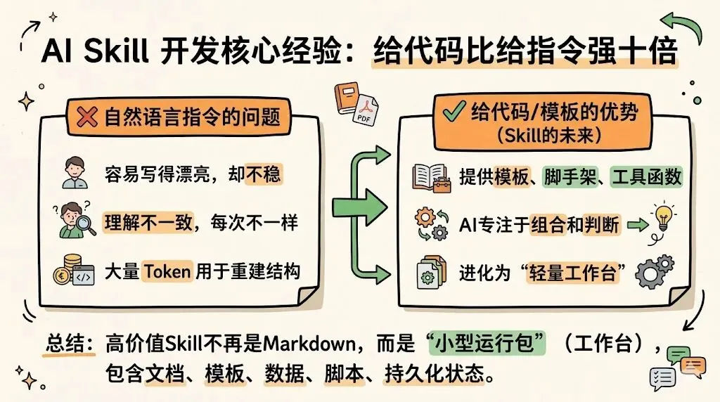 自然语言指令的问题在于,它很容易写得漂亮,却不一定稳。你告诉模型“请按我们的规范生成一个模板”,它每次都可能理解得有点不一样;可如果你直接给它模板、脚手架、工具函数和现成脚本,它就不需要花大量 token 去重建结构,而是可以把精力放在组合和判断上。