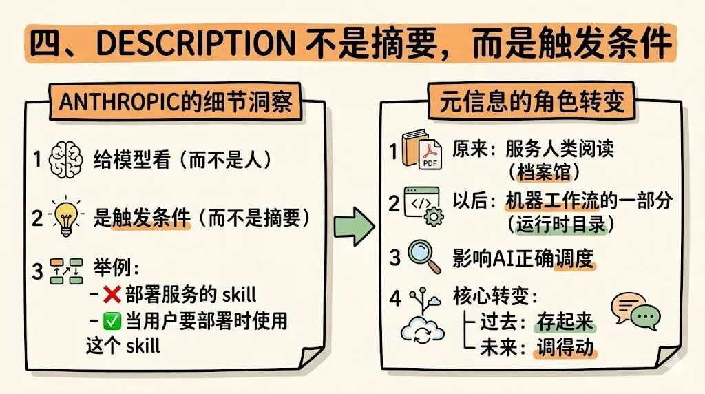 Anthropic 还提到了一个特别妙的小细节:description 字段不是给人看的摘要,而是给模型看的触发条件。