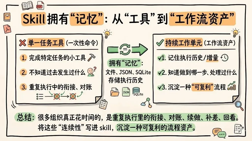 一旦一个 skill 能记住过去发生过什么,它就不只是一个帮助你完成任务的小工具,而开始成为一条可复用的工作流。它知道:
