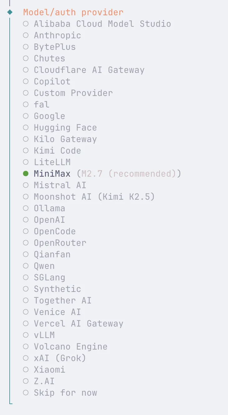 跟着屏幕提示走就行,全部选默认项也可以。 到这边选一下模型配置的信息。你有哪家的 API key,或者购买了哪家的包月服务,就选哪家。