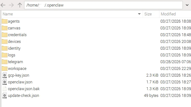 Openclaw安装完毕,来看看它的安装目录上面有哪些文件和文件夹,默认的安装路径是在/home/username/.openclaw,这里比较重要的一个文件是openclaw.json,相当于一个全局的配置文件,来看看里面有什么内容:第一段是wizard(向导),看起来是记录了openclaw运行的一些基本信息,比如版本和时间什么的。 "wizard": { "lastRunAt": "2026-03-27T23:09:12.236Z", "lastRunVersion": "2026.3.24", "lastRunCommand": "onboard", "lastRunMode": "local" },