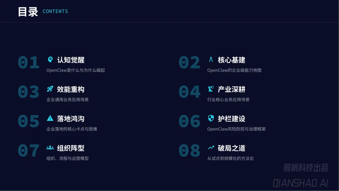 这份《OpenClaw 企业级智能体应用手册》由前哨科技出品,围绕 OpenClaw 开源企业级 AI 智能体框架展开,全面阐述其从技术架构、核心能力到企业落地、行业应用、风险防控及规模化实施的全维度内容,核心是实现 AI 从 “对话” 到 “执行” 的跃迁,助力企业重构业务流、拥抱 Agentic AI 时代,以下是核心总结。