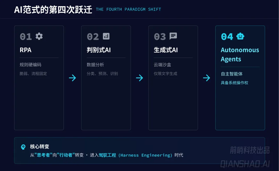 AI 经历了 RPA、判别式 AI、生成式 AI 后的第四次跃迁,进入自主智能体(Autonomous Agents) 时代,核心是从 “思考者” 向 “行动者” 转变,OpenClaw 是这一趋势下的核心产物。