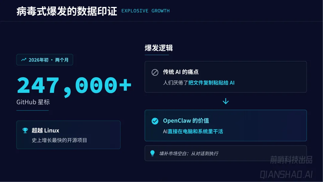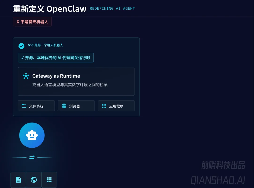 OpenClaw 并非聊天机器人,而是开源、本地优先的 AI 代理网关运行时,充当大语言模型与真实数字环境(文件系统、浏览器、应用程序)的桥梁,可让 AI 直接在电脑和系统中执行任务,填补了 “从对话到执行” 的市场空白,也是史上增长最快的开源项目(2026 年初两个月获 24.7 万 + GitHub 星标)。