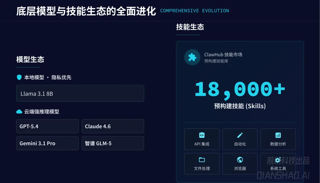 底层生态支撑:模型生态兼容本地(Llama 3.1 8B 等)与云端强推理模型(GPT-5.4、Claude 4.6、智谱 GLM-5 等);技能生态拥有 ClawHub 技能市场,含 1.8 万 + 预构建技能,覆盖自动化、数据分析、系统工具等多领域。