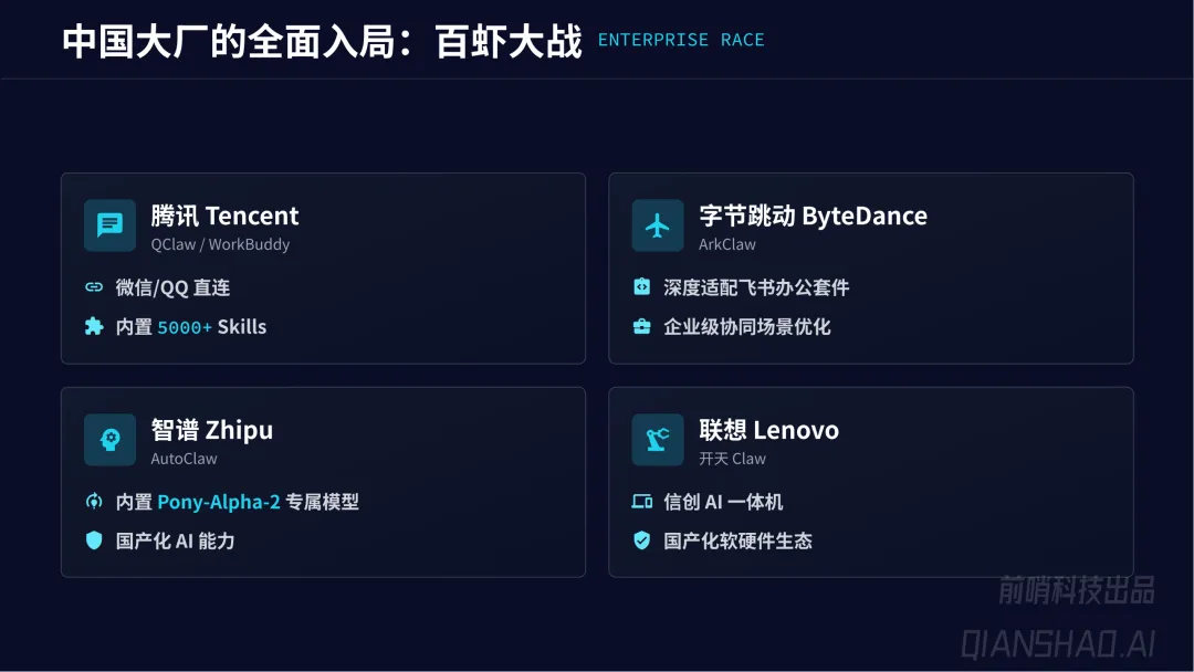 国内大厂纷纷入局布局相关产品(腾讯 QClaw、字节 ArkClaw、智谱 AutoClaw、联想开天 Claw),形成 “百虾大战” 的产业格局,各产品结合自身生态实现差异化适配。