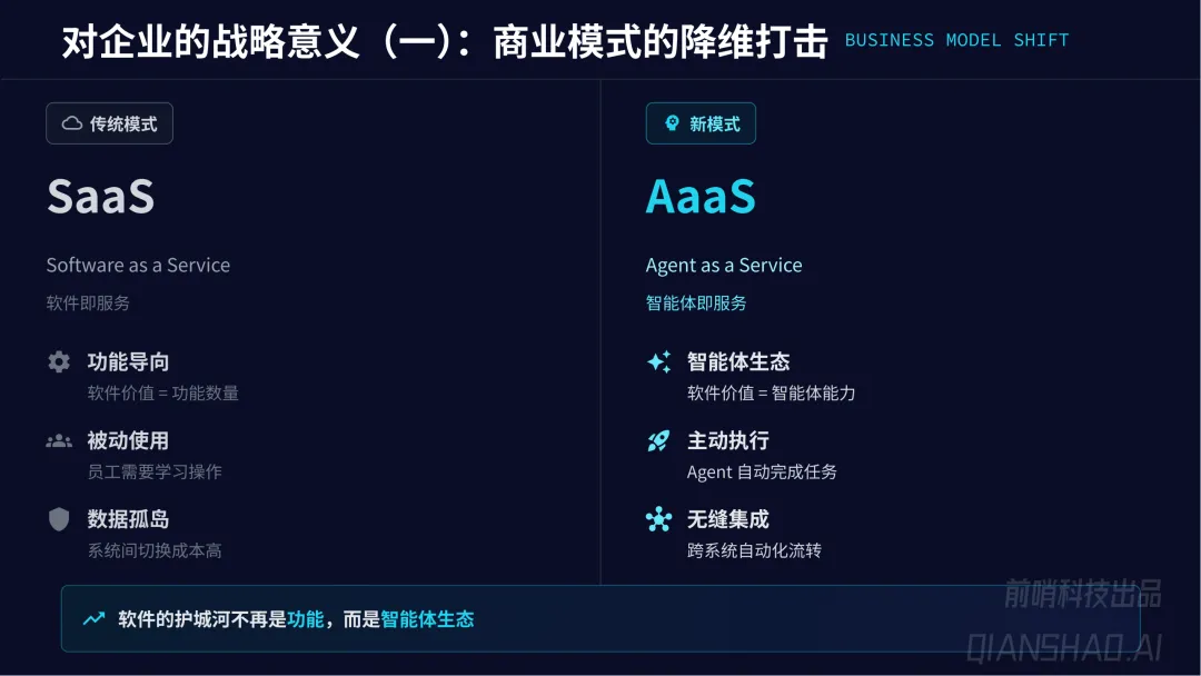 商业模式从 SaaS(软件即服务,功能导向、被动使用)向 AaaS(智能体即服务,生态导向、主动执行)转变,软件护城河从功能数量变为智能体生态;