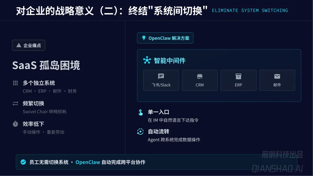 终结企业 “SaaS 孤岛困境”,作为智能中间件实现跨系统无缝集成,消除员工 “系统间切换” 的效率损耗,通过 IM 自然语言指令即可完成跨平台协作。