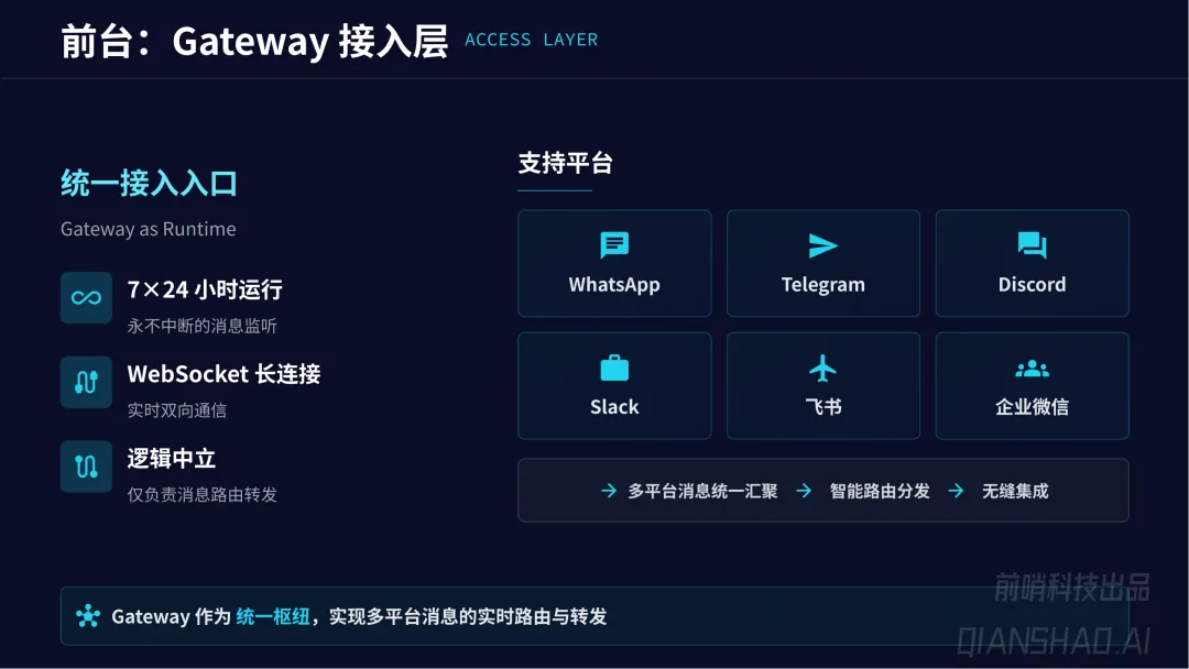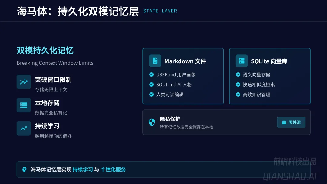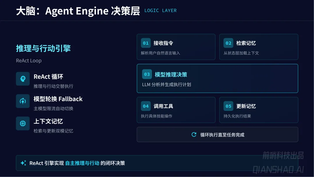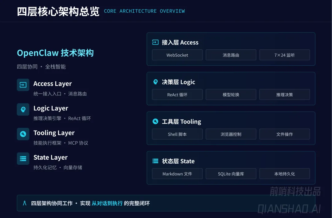 四层核心架构实现 “从对话到执行” 闭环:接入层(统一多平台入口、7×24 消息路由)、决策层(ReAct 循环推理引擎、模型轮换)、工具层(MCP 协议技能框架,支持 Shell、API、浏览器控制等多类执行操作)、状态层(Markdown+SQLite 双模本地持久化记忆,突破上下文限制、保障数据隐私);额外搭配主动引擎调度层,实现 AI 从被动响应到主动巡检(心跳机制 + Cron 时序调度)。