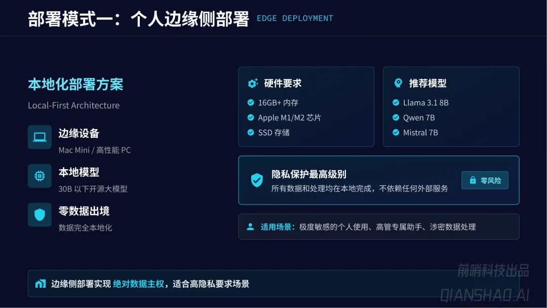 三种部署模式满足不同需求:个人边缘侧部署(本地运行、零数据出境,高隐私场景)、企业内网沙箱部署(容器隔离、合规认证,满足等保三级等要求)、公有云轻量托管(一键部署、成本低,适合开发者 / 小团队)。