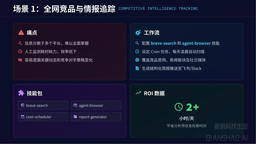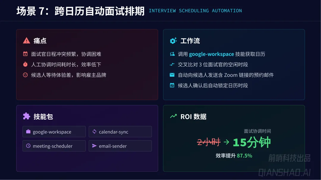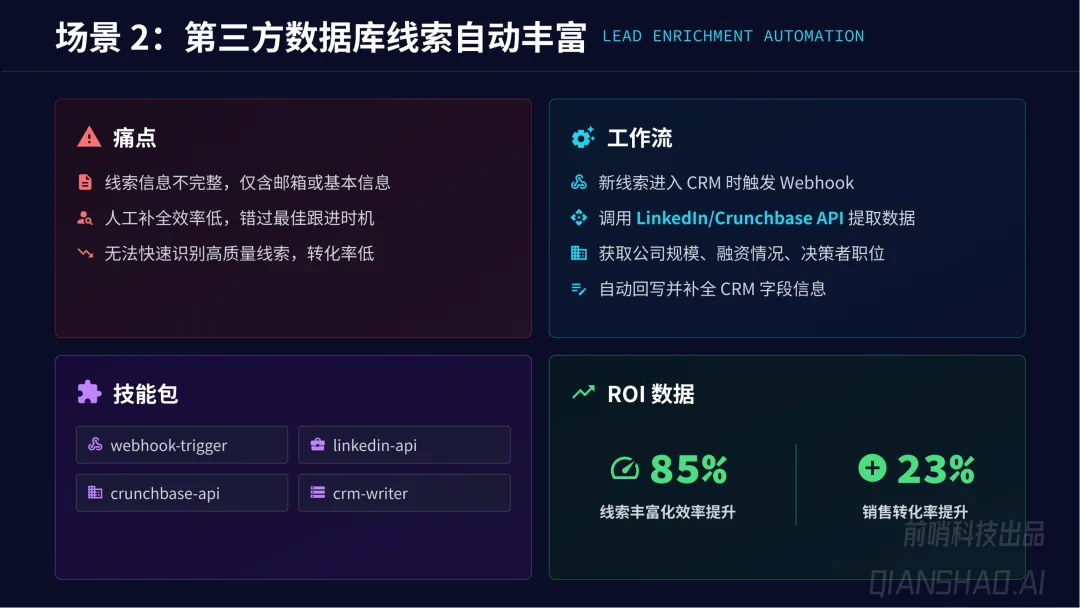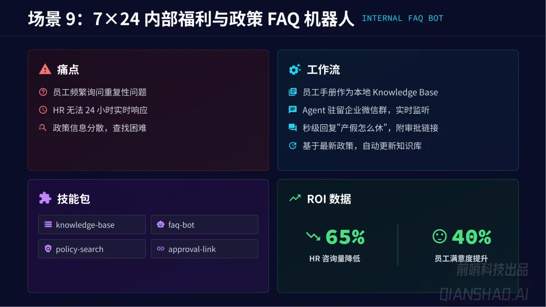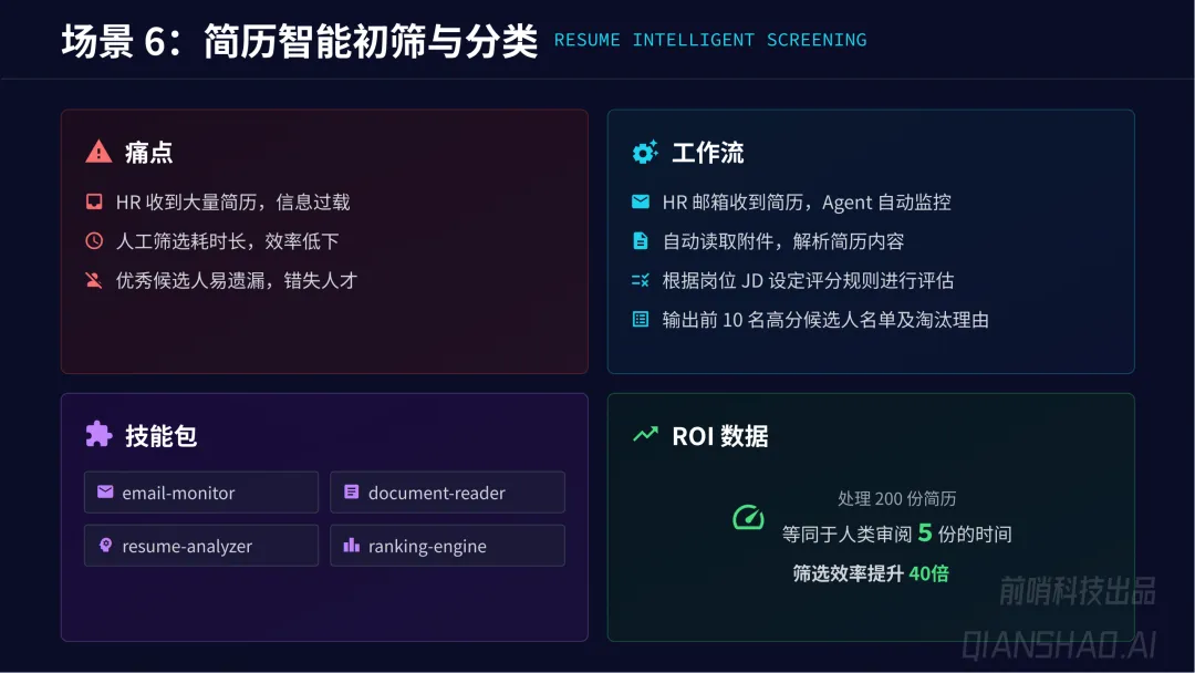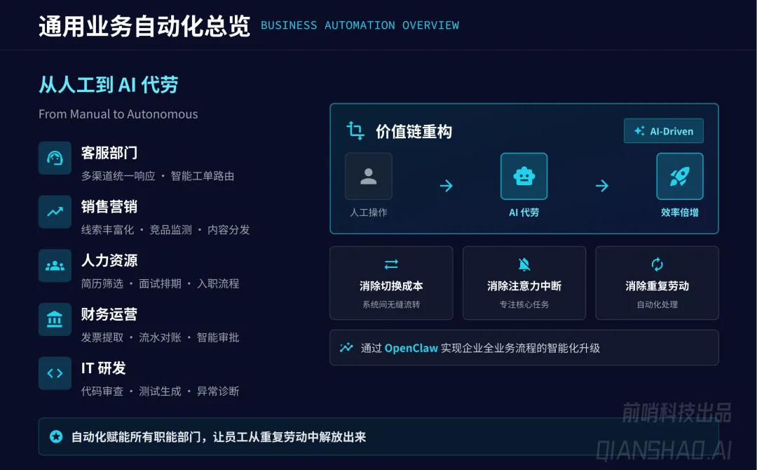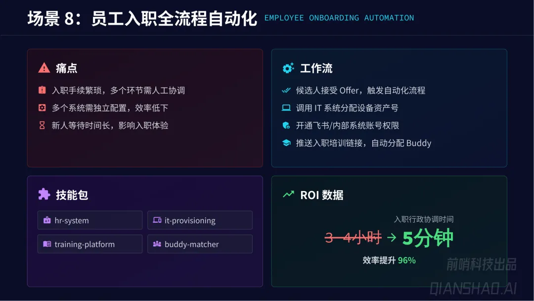 通用业务自动化:覆盖销售营销、人力资源、财务运营、IT 研发、客服等全职能部门,共 19 个核心场景,如竞品情报追踪、线索自动丰富、简历智能初筛、发票自动提取、代码自动审查等,平均实现65% 任务执行时间缩短、80% 人工干预率降低、45% 员工满意度提升、30% 运营成本节约。