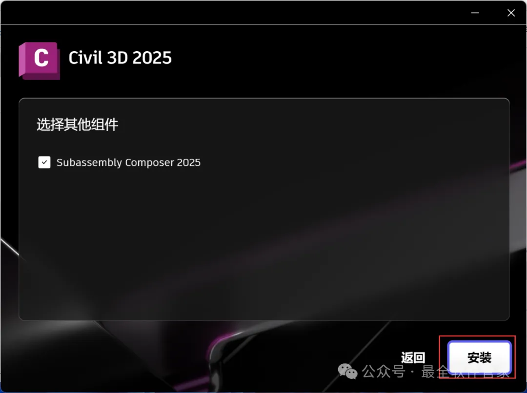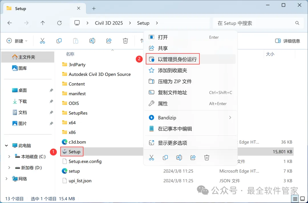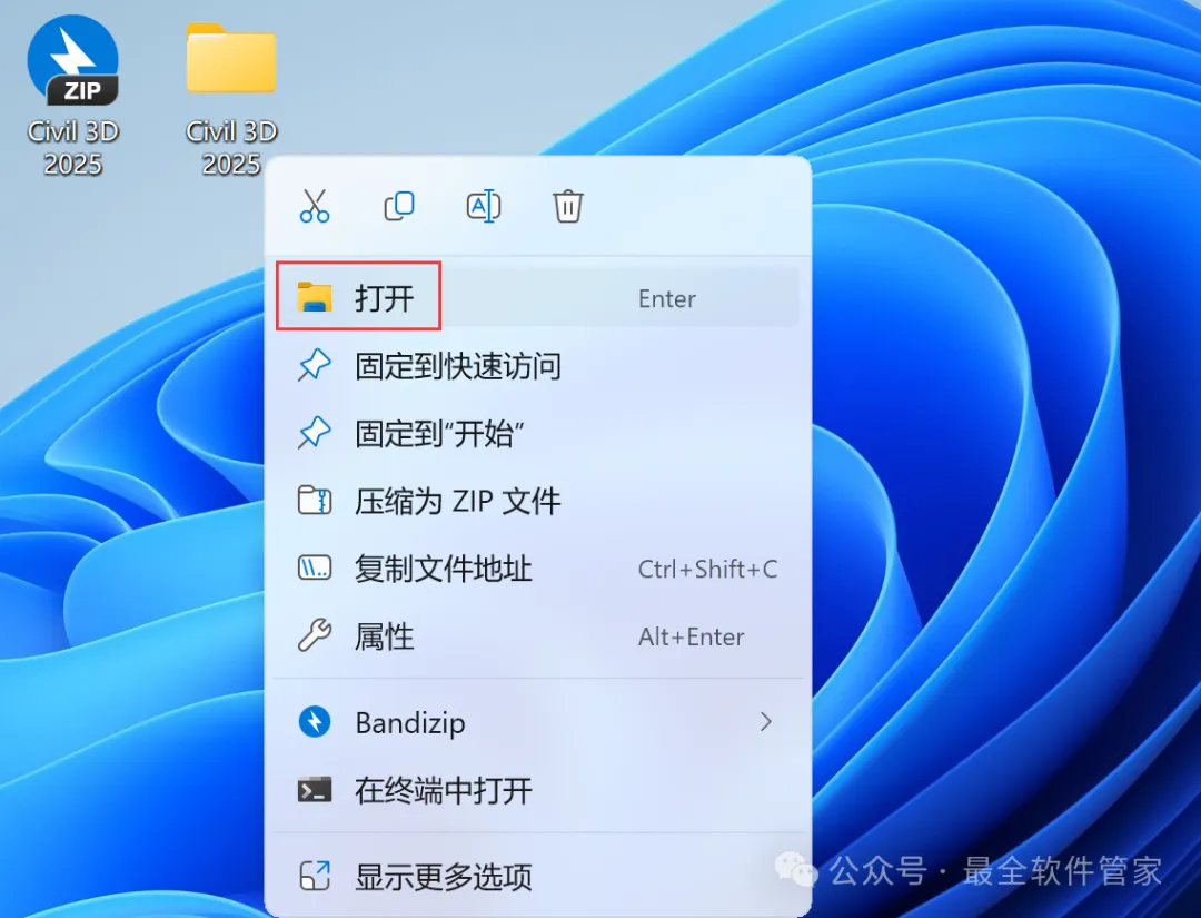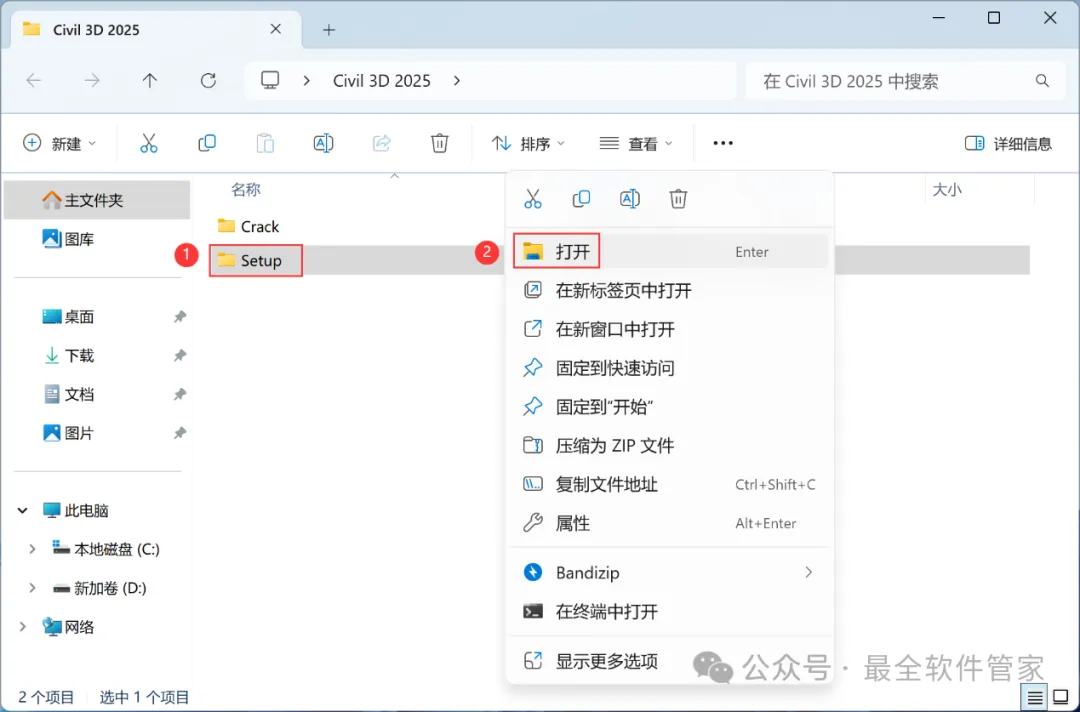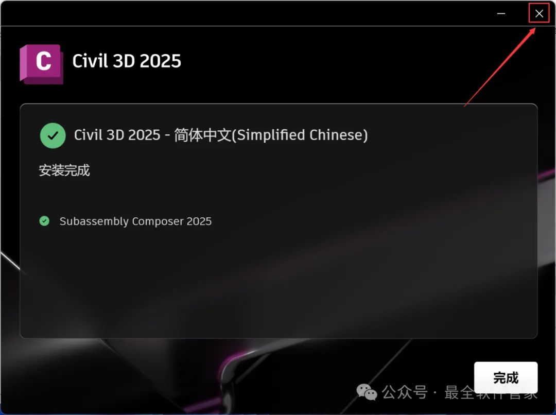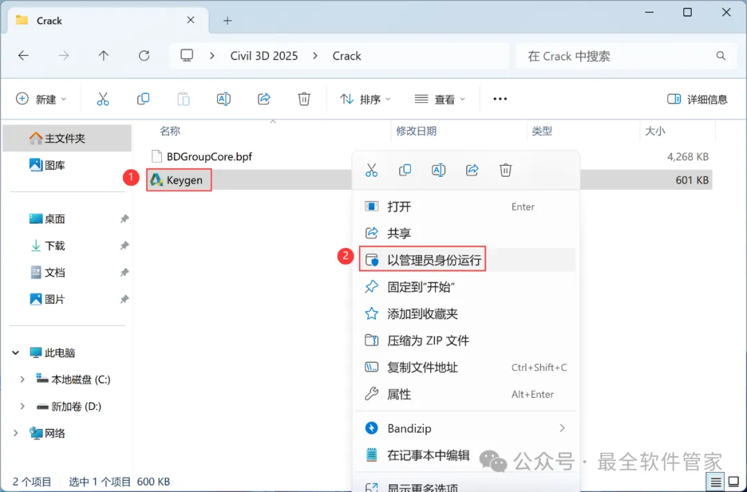 安装需知[软件名称]:Civil 3D 2025[软件大小]:5.77G[软件语言]:中文简体[安装环境]:Win10及以上版本[下载地址]:公众号内回复:Civil3D[不限速下载]:免费获取百度网盘不限速下载工具。公众号内回复:不限速[注意事项]:安装前请关闭网络、杀毒软件和防火墙,否则易安装失败。公众号内回复:1[解压软件]:小编用的解压软件是Bandizip,获取Bandizip软件安装包。公众号内回复:2安装教程1、下载Civil 3D 2025软件安装包到电脑上,右键选择【解压到Civil 3D 2025\】2、右键【打开】解压后的文件夹3、找到【Setup】文件夹,右键【打开】它4、找到【Setup】应用程序,右键选择【以管理员身份运行】它5、勾选【我同意】,再点击【下一步】6、软件默认安装在C盘,可自定义更改软件安装位置,这里小编选择安装在D盘;点击【下一步】7、点击【安装】8、软件安装中,稍等片刻9、软件安装成功,点击右上角【关闭按钮】10、回到Civil 3D 2025文件夹,找到【Crack】文件夹,右键【打开】它11、找到【Keygen】文件,右键选择【以管理员身份运行】它12、找到并选中【Civil 3D 2025】,再点击【安装】13、点击【好的】14、点击右上角【关闭按钮】15、回到桌面,右键桌面上的【Civil 3D 2025软件图标】,点击【打开】16、软件正在打开,启动界面如下:17、软件打开成功,运行界面如下:18、以上就是Civil 3D 2025软件安装的全过程,要是对你有帮助的话,请为小编点个赞!免责声明:软件资源均来源于网络,仅供用户交流学习与研究使用,版权归属原版权方所有,版权争议与本公众号无关,用户本人下载后不能用作商业或非法用途,否则后果均由用户承担责任;如果您访问和下载此文件,表示您同意只将此软件用于参考、学习而非其他用途,否则一切后果请您自行承担,请于下载后24小时内删除,不允许用于商业用途,否则法律问题自行承担。如果您喜欢该软件,请支持正版软件,购买注册,得到更好的正版服务。