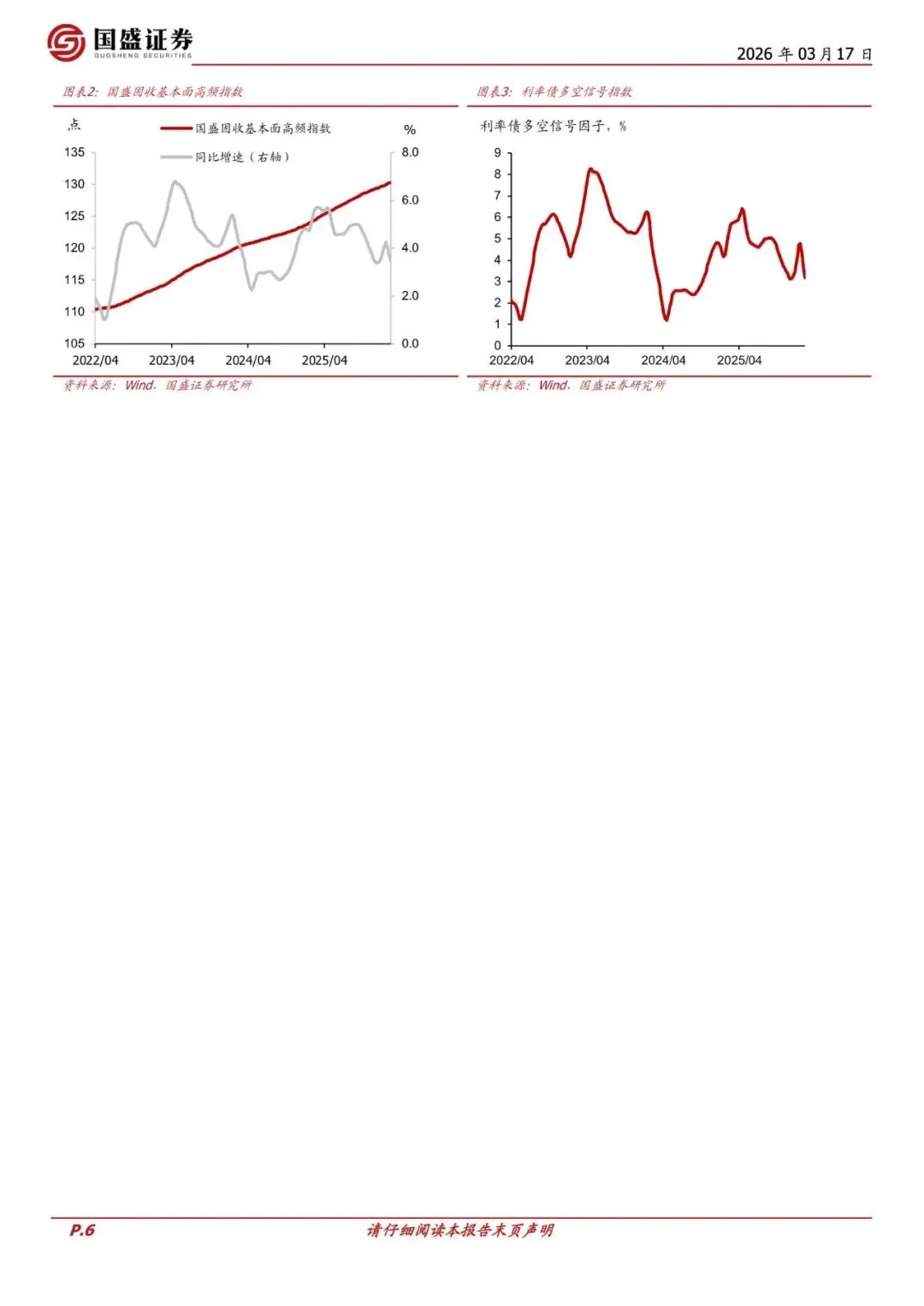 本期国盛基本面高频指数为130.3点(前值为130.2点),当周问此增加5.9点。利率债多空信号因子为3.2%(前值为3.7%)。