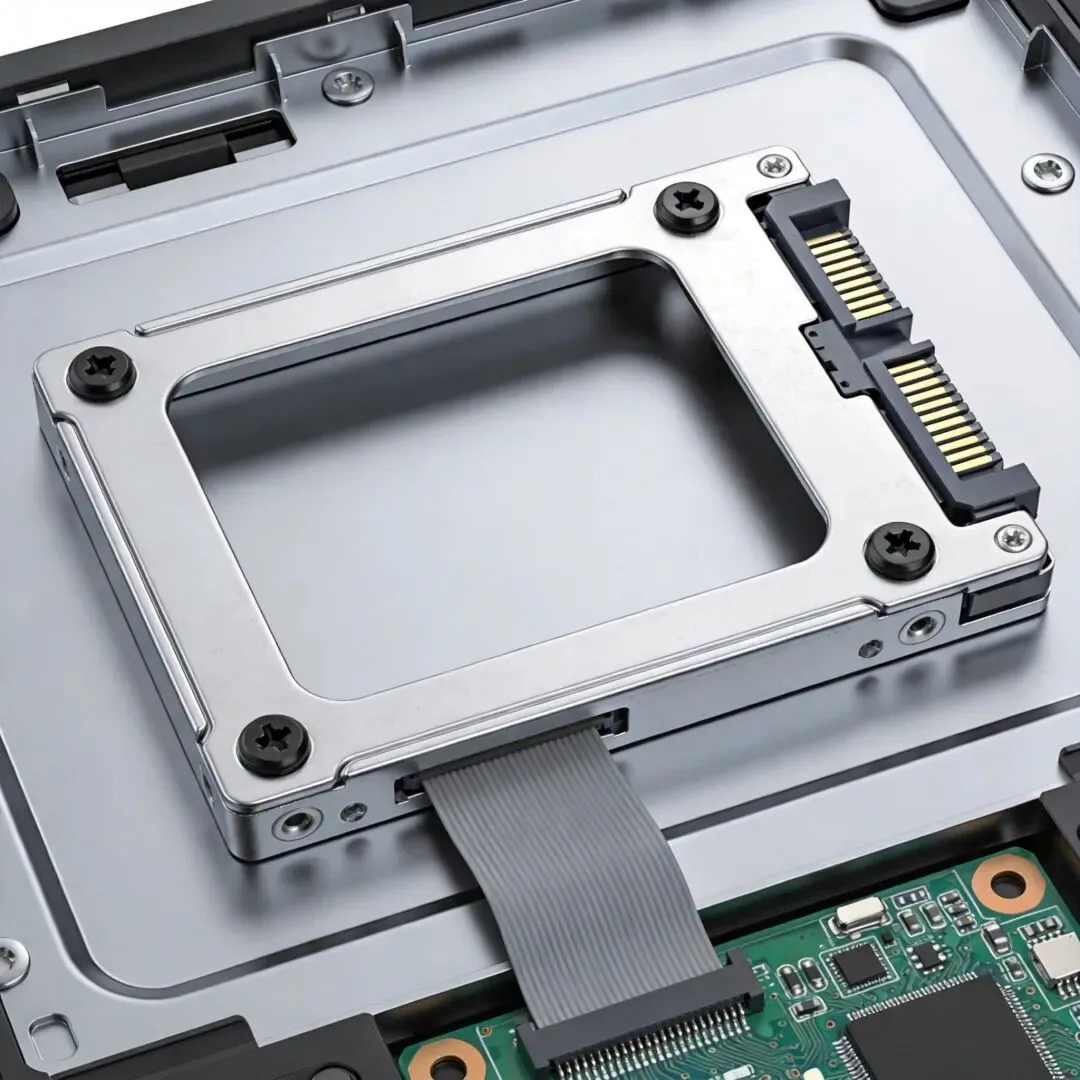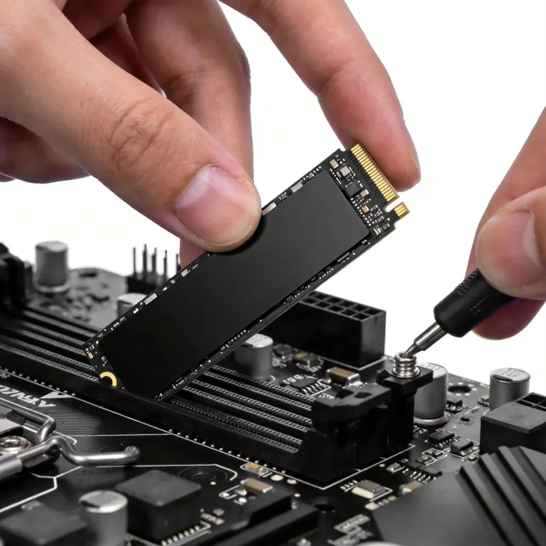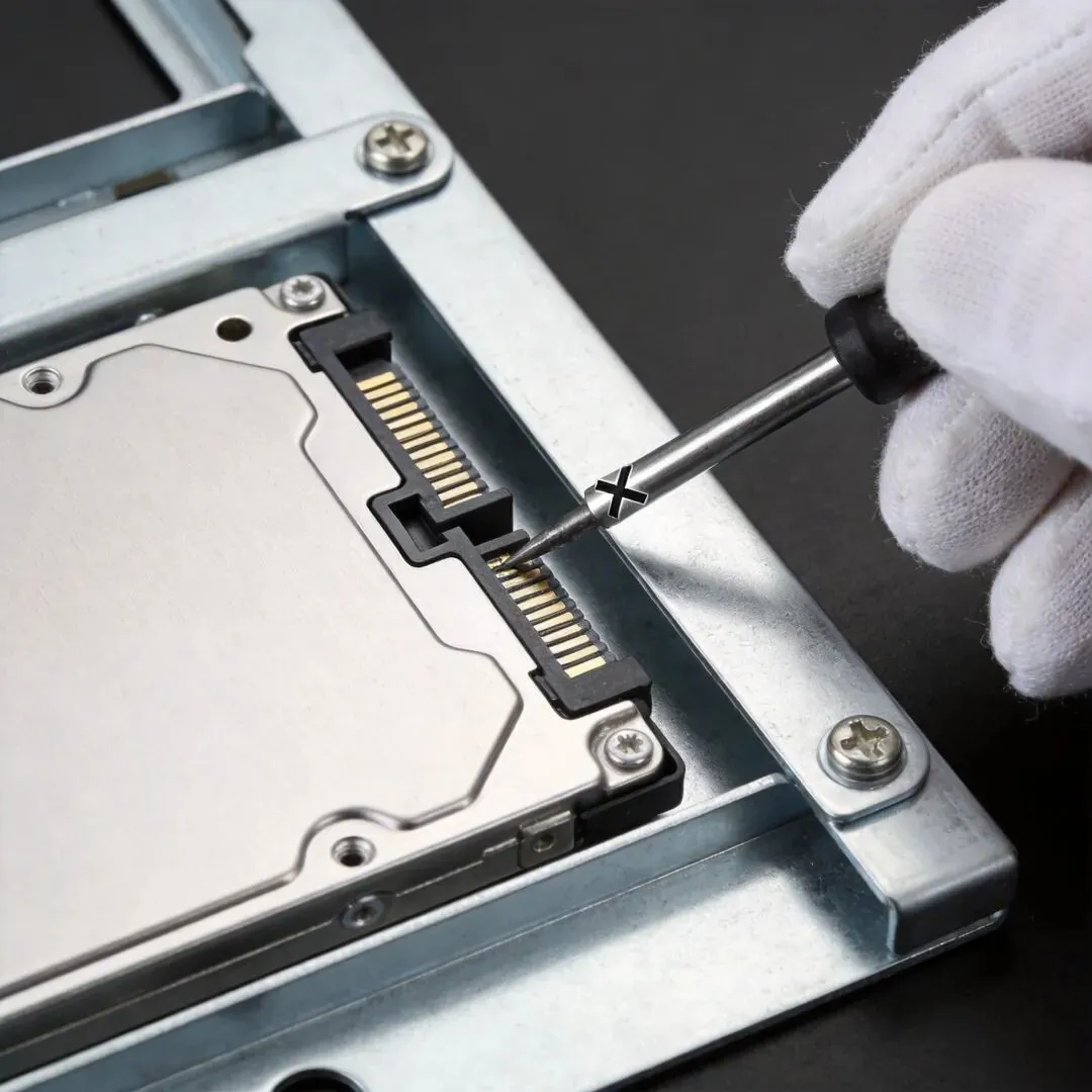 2. 对准SATA数据接口,轻轻插入(有L型防呆,反向插不进)3. 拧回固定螺丝4. 插上SATA数据线(确保插到底,听到"咔嗒"声)安装检查: