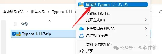 1.解压安装包:鼠标右击【Typora1.11.7】压缩包,选择电脑上安装的解压软件,点击解压到【Typora1.11.7】。