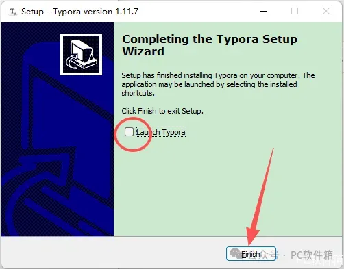 9.取消勾选【Launch Typora】,点击【Finish】。