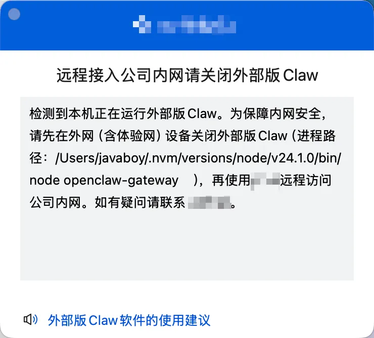 这个提示说的很明白了,公司的办公软件检测到了 OpenClaw 的进程,直接给标记了,这个应该是最近刚上的功能,之前即使打开了 openclaw 也是可以连接公司内网的。