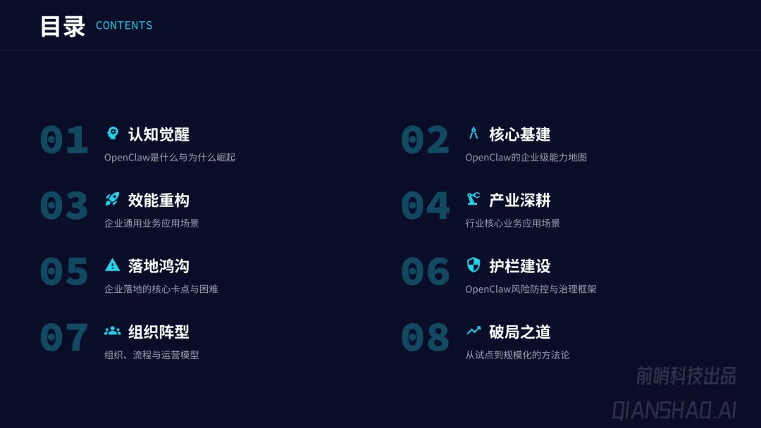 2026年从对话到执行:OpenClaw企业级智能体应用手册-前哨科技OpenClaw 是前哨科技推出的开源、本地优先的企业级 AI 智能体网关运行时,作为大模型与真实数字环境的桥梁,实现从自然语言对话到系统自动执行的闭环,是 AI 范式第四次跃迁的核心载体,已成为 GitHub 增长最快的开源项目之一。————全文获取见文末需要下载完整版报告的朋友,可以扫下方优惠券付费成为会员,(现在加入仅需36/年)600000+份报告,随意下载,不受限制,(支持PC端/APP),星球保持每日更新。客服微信:SCBGK666↓微信扫码领优惠加入星球↓