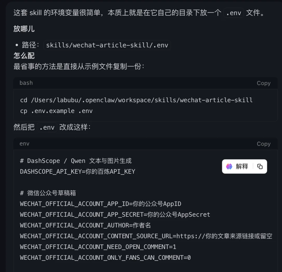 1. OpenClaw 安装 Skill2. 配置环境变量3. 申请微信公众号API接口4. 申请通义万象文生图大模型5. 调用发布全流程