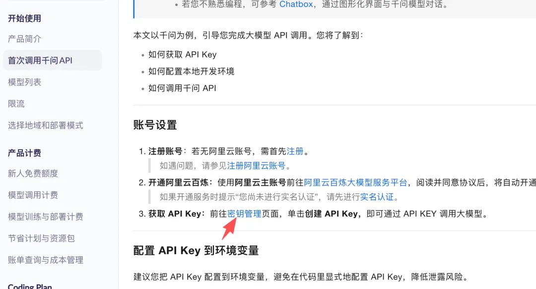 https://bailian.console.aliyun.com/cn-beijing/?tab=doc#/doc/?type=model&url=2840915复制链接浏览器打开,可以看到平台对于第一次使用的配置介绍点击密钥管理,然后在页面点击创建密钥
