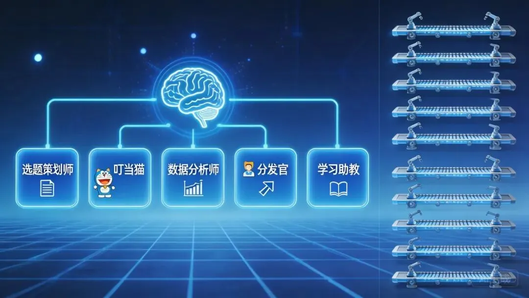 5 个飞书 AI 员工,13 条自动化生产线,50 个专业技能模块,每天自动推选题、写文案、发内容、采数据、跑复盘。