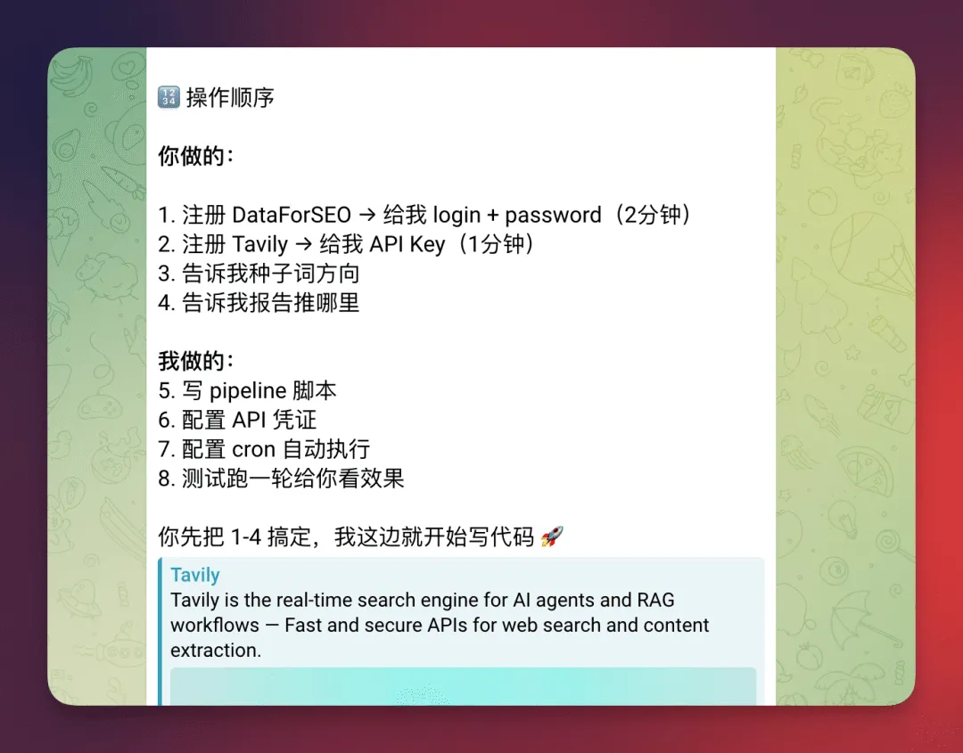 帮我搭一套需求挖掘系统,参考这篇文章 [链接]。种子关键词方向:SEO 工具、效率工具、AI 图片生成、SaaS 工具站、API 聚合、转换工具,面向出海市场。要求:每天自动跑一次,结果推送到 Telegram 群,同步到 Notion。需要我这边提供的,你罗列出来告诉我,以及拿到这些参数的流程。