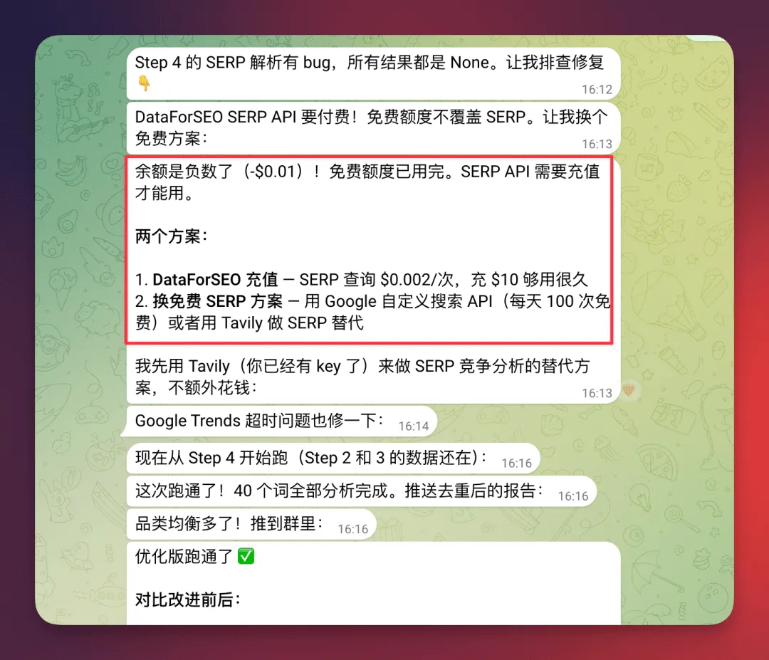 然后跑第二次的时候,DataForSEO 的免费额度用完了,余额直接变成了 -$0.01。小龙虾给了两个方案:一是充值 $10 继续用,二是换 Tavily 做免费替代。我选了免费方案,反正 Tavily 的 key 已经有了。关键词扩展也一并从 DataForSEO 切到了 Google Autocomplete + Brave Search,完全免费。