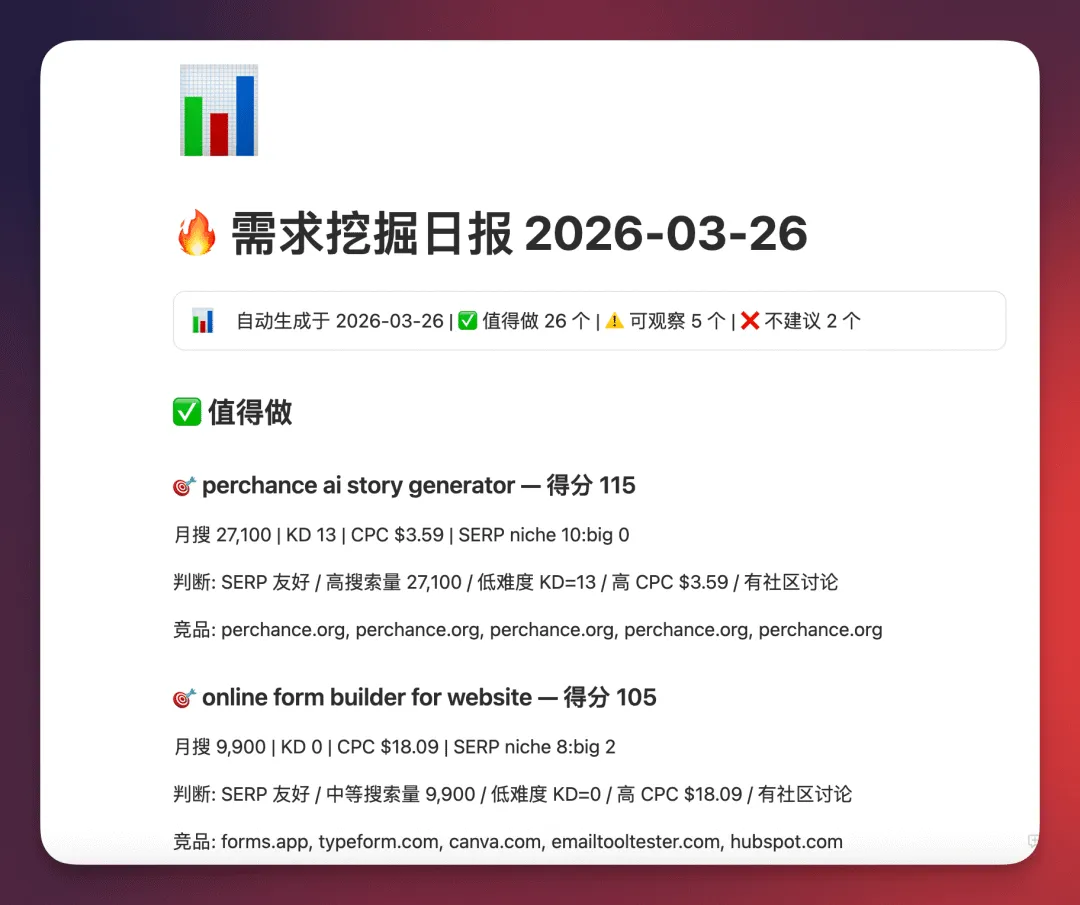 现在可以每天早上看推送的报告,花两分钟,挑 2-3 个感兴趣的方向,手动搜一下 Google 看看首页竞品长什么样。如果确认值得做,花半天做个 MVP 上线测试。