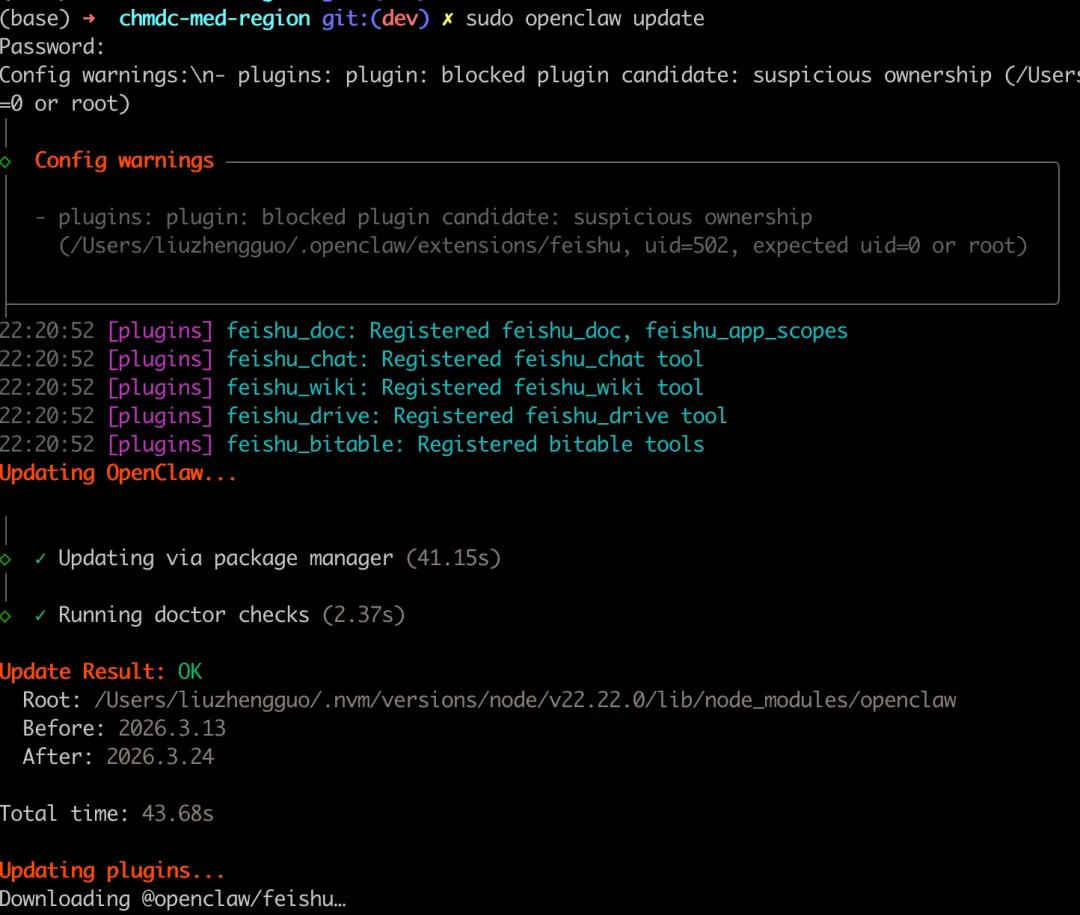 温馨提示:直接执行升级命令,即可自动更新至最新 v2026.3.24 稳定版~