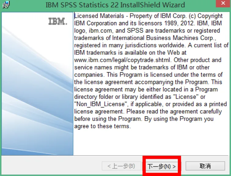 SPSS 22 保姆级安装教程+安装包分享!很多小伙伴下载了SPSS后,不知道怎么安装,特别是如何激活,今天专门出一个安装教程,教大家如何安装激活SPSS。资源里面每个版本都有安装教程,这里我们以SPSS 22 版本为例介绍。下载安装包以后,点击安装包,开始安装,然后点击【下一步】:9DNCAF2O3QVDV7FBIO696OO6GWLNXZPPRYTPWF2PPX7C8T6Y24LMVV2ET7DOLX5CXAL5YDLL79UPGEFCPDXP5Q8O5E