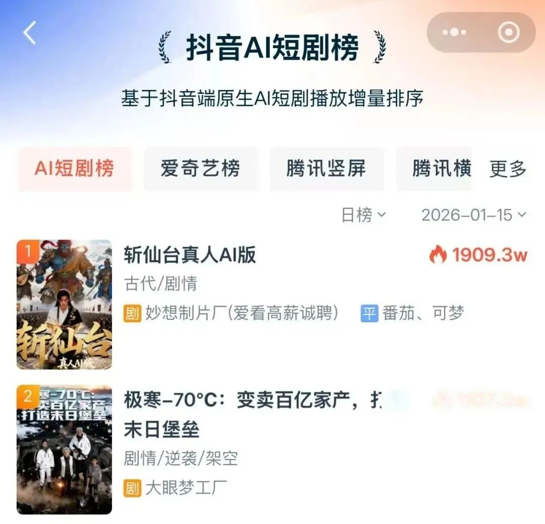而且它不是孤例。今年春节档,AI漫剧总播放量突破25亿次,拿下短剧大盘将近三成份额。AI仿真人漫剧贡献了超80%的播放量,连续多天包揽榜单前四。