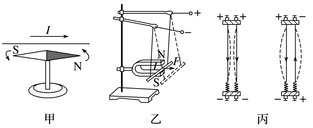 C.图丙中电流间的相互作用是通过电流的磁场产生的