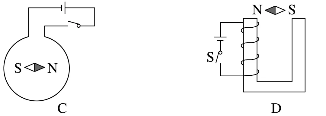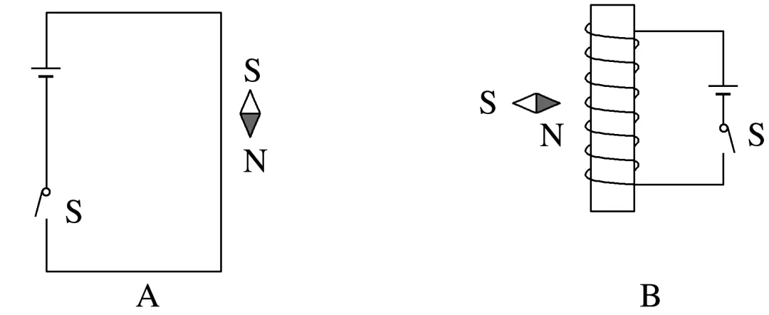 A.图甲中,电流不产生磁场,电流对小磁针的作用力是通过小磁针的磁场产生的