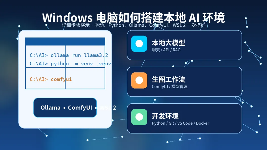 这不是一篇只讲概念的“工具介绍文”,而是一篇按顺序操作就能跑通的 Windows 本地 AI 环境搭建指南。你看完之后,至少应该能完成四件事:一是在本机跑起一个本地大模型;二是能在命令行中管理 Python 环境;三是能安装并启动本地生图工作流;四是知道什么时候该用 Windows 原生,什么时候该切到 WSL 2。