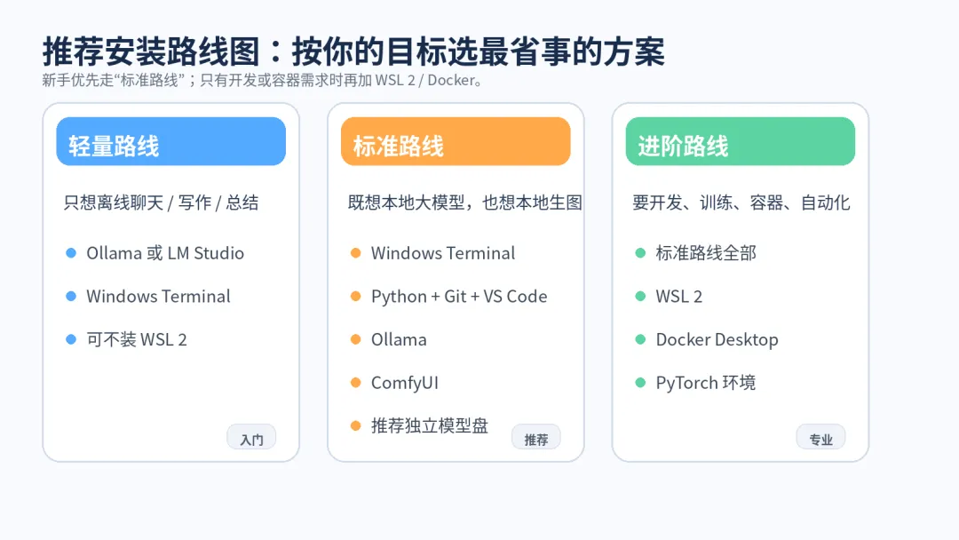 完全新手 / 想在本机离线跑模型与生图的用户 | 跑通本地大模型、本地生图、虚拟环境与基础排错 | Windows Terminal + Python + Git + VS Code + Ollama + ComfyUI;进阶再加 WSL 2 / Docker |