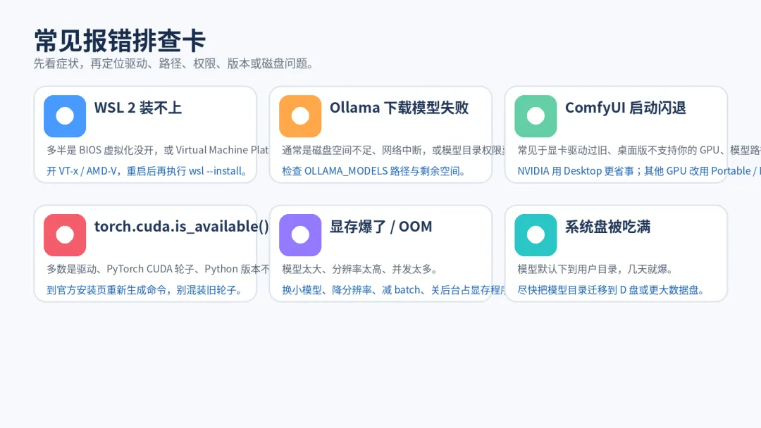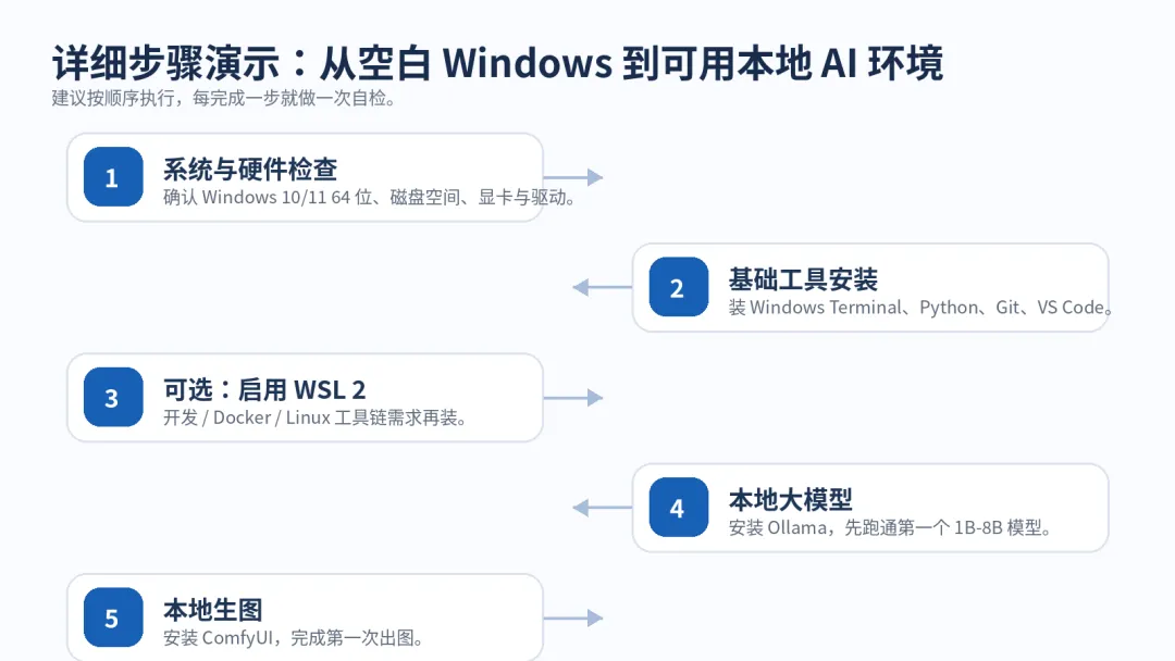 Windows 本地 AI 环境并不等于“必须高配”。你可以从轻量路线开始:先用 CPU 或较小模型完成聊天与测试,再根据实际需要逐步增加 GPU、生图工作流或开发工具。真正会让新手反复卡住的,往往不是显卡不够强,而是驱动、路径、版本和磁盘规划一开始没有做对。
