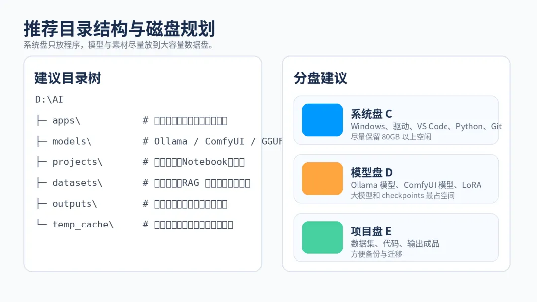 本地 AI 环境最容易被忽视的不是安装,而是空间管理。模型、LoRA、checkpoints、输出图像、缓存、数据集,随便堆几天就能把系统盘吃满。最佳实践是:程序留在系统盘,模型与素材迁到独立数据盘,项目与输出单独管理。