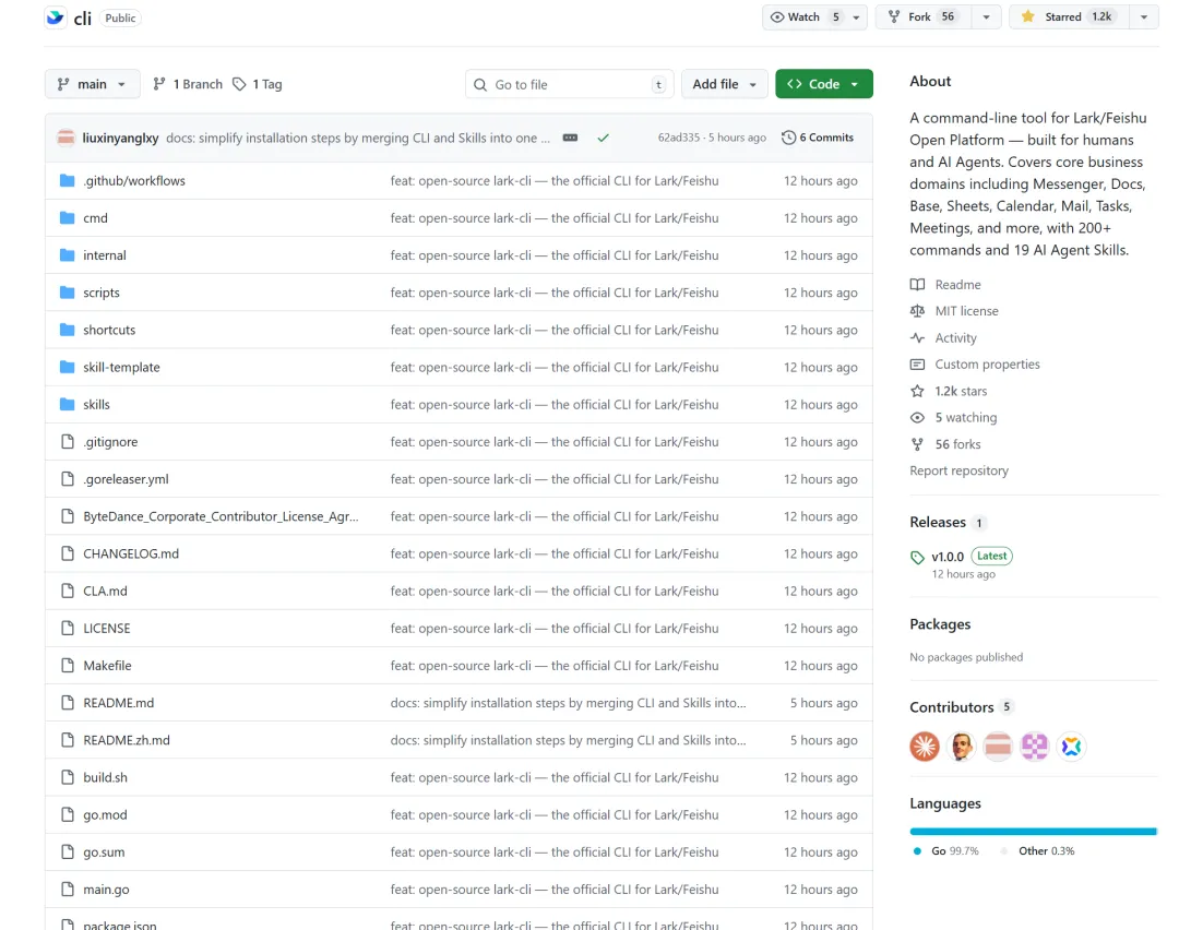 这是飞书开放平台官方开源的命令行工具,覆盖11个业务域、200+命令,内置19个Agent Skills。