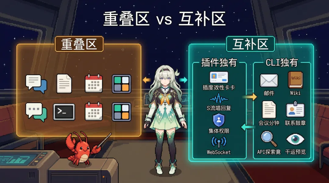 在这个重叠区里,日常高频操作(查日程、发消息、读文档、更新表格)用哪个都行。如果你只用这些功能,OpenClaw插件体验更流畅——因为对话式交互天然比命令行更直观。