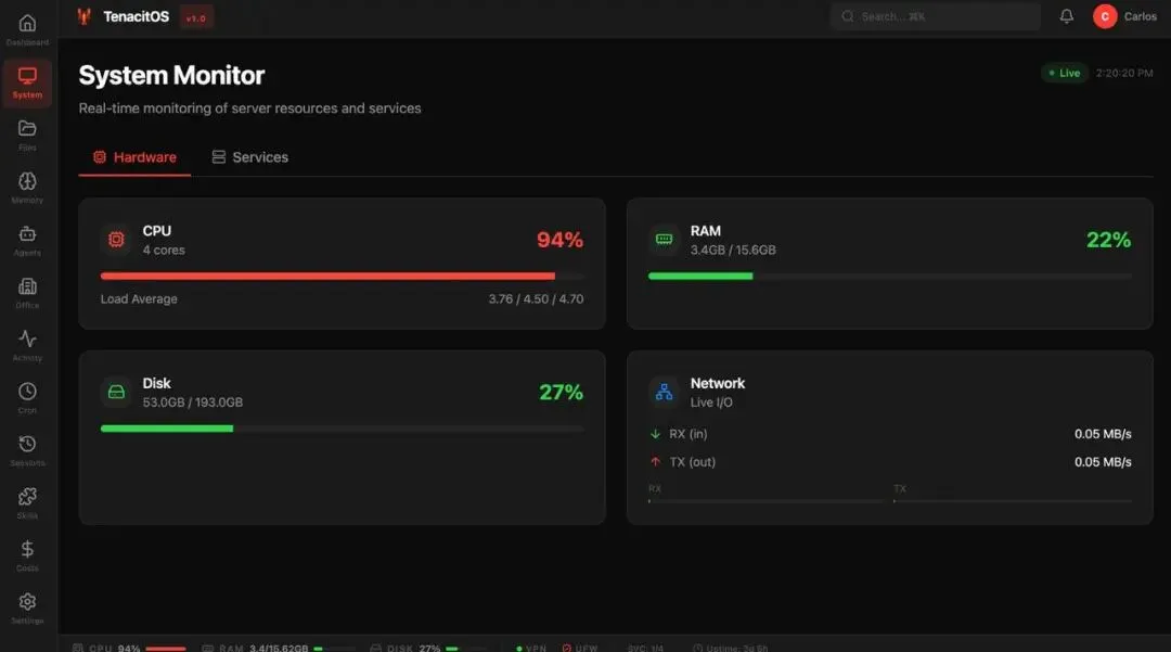 告别复杂的命令行。 TenacitOS提供了服务器级别的实时监控面板,CPU负载、内存占用、磁盘I/O、网络流量一目了然。
