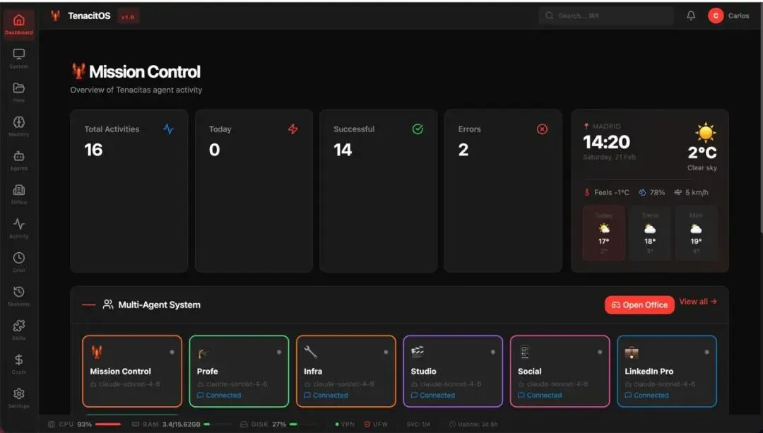 这是TenacitOS最具创新性和辨识度的功能。 它构建了一个交互式的3D虚拟办公室,每个AI Agent都拥有自己独立的“工位”。工位的状态(如灯光、屏幕内容)实时反映对应Agent的运行状态。