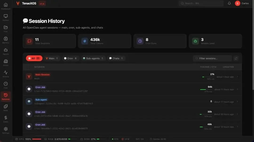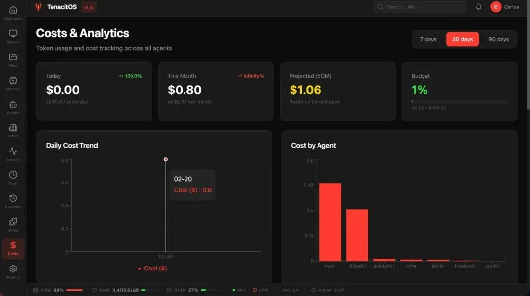 基于OpenClaw本地SQLite数据库中的真实调用记录,TenacitOS能进行细致的成本分析。你可以按Agent、按时间、按模型类型查看支出趋势图。这项功能对于企业级部署和追求成本优化的个人开发者来说至关重要,它能精准定位“烧钱”的环节,让每一分Token都花在刀刃上。