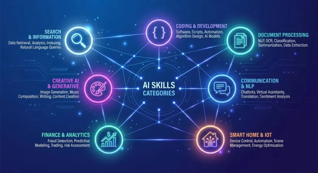 这些技能覆盖了 AI 助手能做的几乎所有事情: