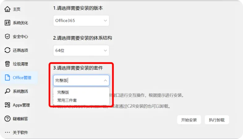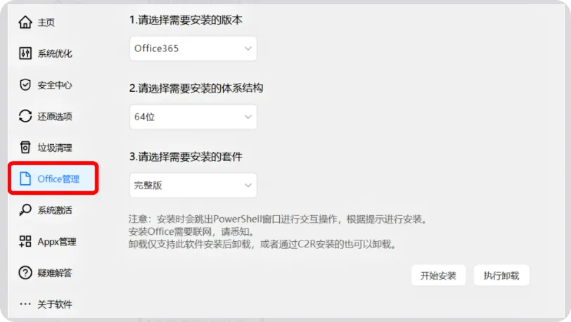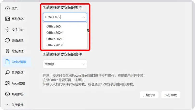 这款工具最牛的就是Office一键安装:打开就能选Office 2021、2019、365完整版,64位专业版、家庭学生版、三件套随便挑。在线自动下载安装、自动激活、自动卸载旧版Office,不用你找镜像、不用改设置、全程傻瓜式操作。