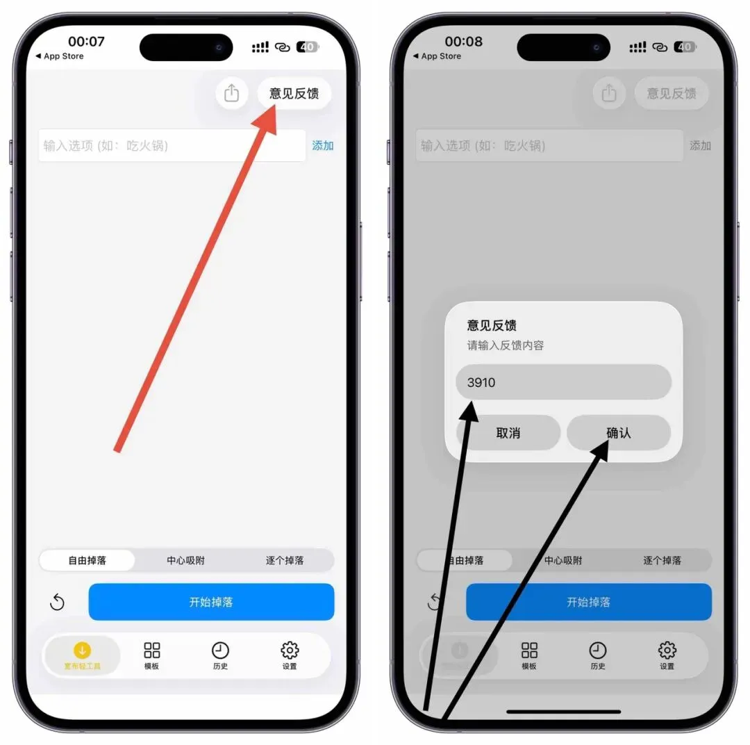 首页,右上角,意见反馈,输入,3910,确认,划掉后台重新进