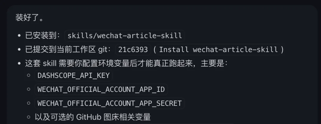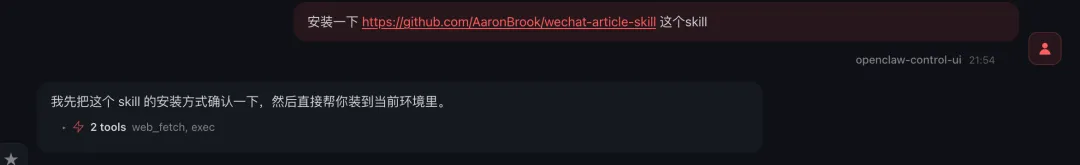 项目地址:https://github.com/AaronBrook/wechat-article-skill直接对话输入,安装这个地址的skill,然后OpenClaw 就会自动给你安装比如见下图